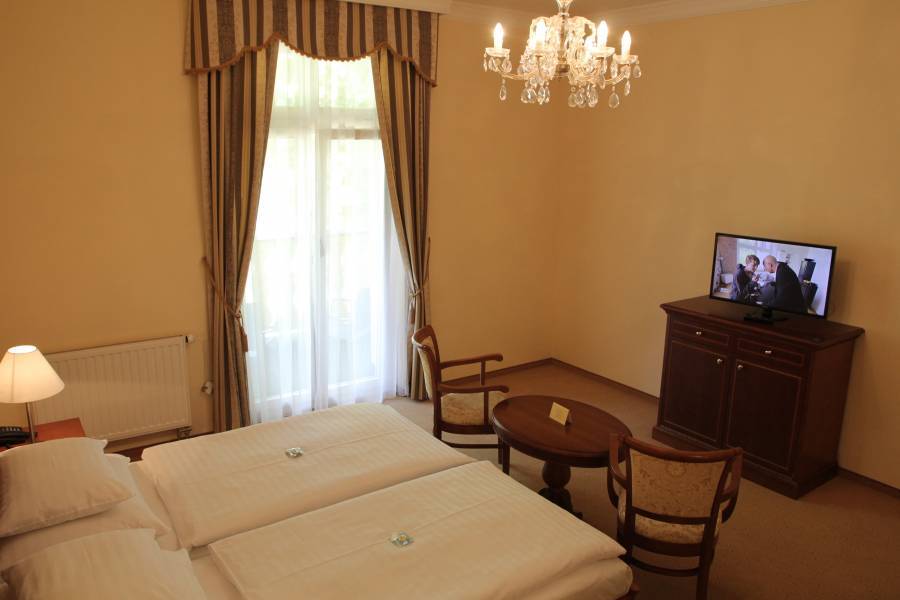 Апартаменты с балконом, спальня + небольшая гостиная комната отделенная дверью, диван и кресло, площадь около 16,30м² (спальня) + около 14м² (гостиная) + ванная 4м²; ванная оборудованная биде и душем.