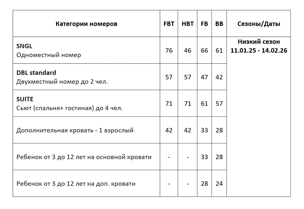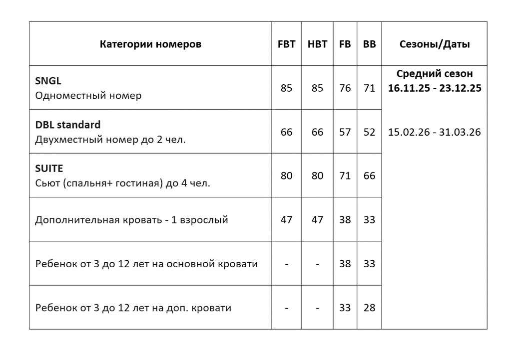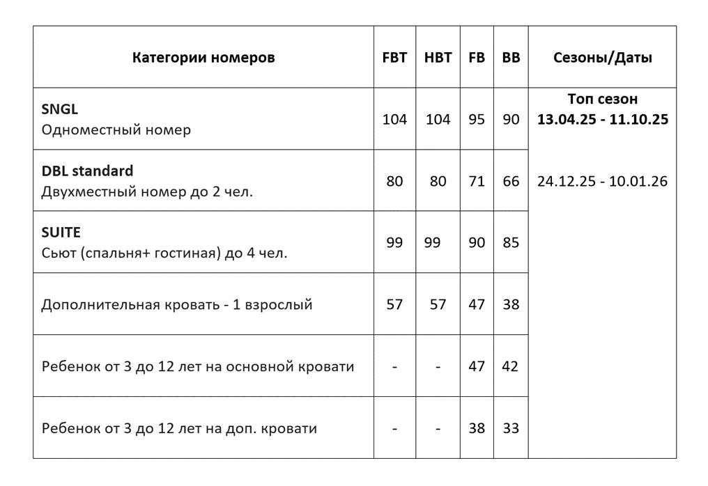ЦЕНЫ с 06.04.2025 по 31.03.2026 г. FBT - трехразовое питание и комплексное курортное лечение в евро на 1 чел/ночь HBT - двухразовое питание и комплексное курортное лечение в евро на 1 чел/ночь. FB - трехразовое питание без лечения в евро на 1 чел/ночь BB - с завтраком без лечения в евро на 1 чел/ночь